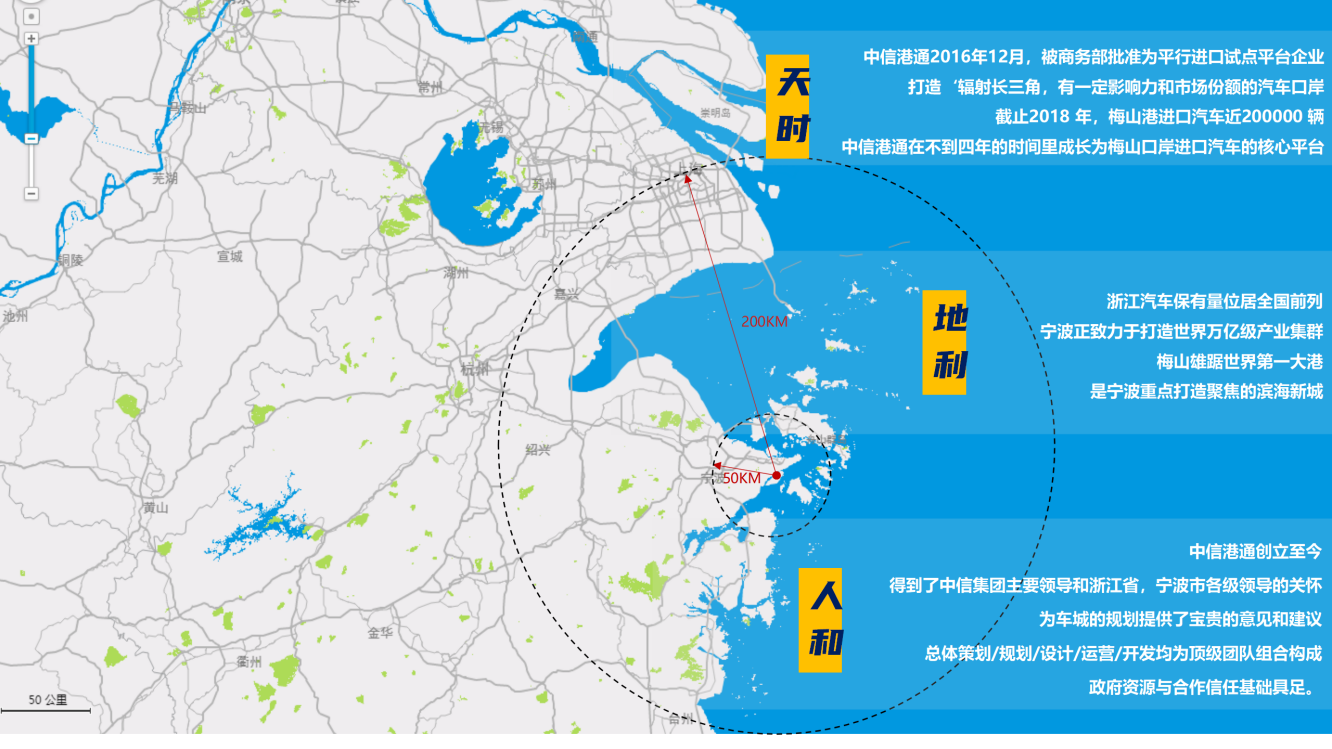 中信港通梅山汽车文化广场位于宁波梅山保税港区,作为浙江省唯一的整车进口口岸,宁波梅山区位地理条件优越,地处长三角南翼,宁波-舟山港核心区域,东临国际航道和国际锚地,北靠北仑港区,南连舟山诸岛,距宁波机场仅1小时车程,是2008年2月24日经国务院批准设立,继上海洋山、天津东疆、大连大窑湾、海南洋浦之后的中国第五个保税港区。2020年4月,整合优化为宁波梅山综合保税区,2020年9月,又被纳入浙江省自贸区宁波片区,享受国家自贸区各项政策。